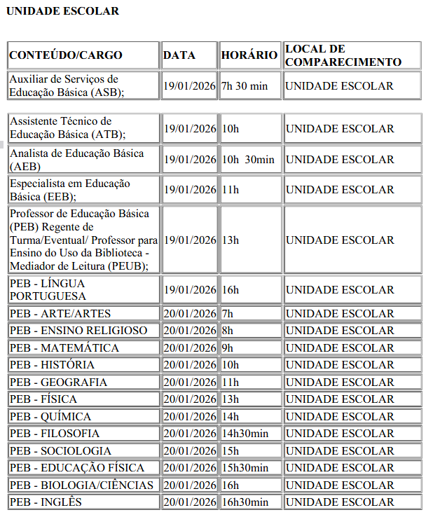 A apresentação do candidato na unidade de ensino/SRE de Uberaba alocado na 1ª rodada, deverá ocorrer a partir das 7h do dia 19/01/2026 até as 17h do dia 20/01/2026. Considerando o disposto no Manual de Procedimentos Operacionais 2026, visando o estrito cumprimento da ordem de classificação estabelecida pelos Editais, será observado o cronograma abaixo para 1ª rodada: